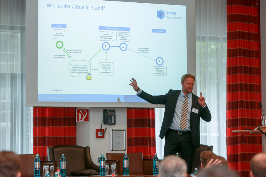 In seinem Impulsvortrag präsentierte HMM-Geschäftsführer Istok Kespret eine zukunftsfähige Lösung mit Blick in die bereits bestehende Realität. Er beleuchtete zunächst den existierenden innovativen Lösungsweg des digitalen Pendants zur papiergebundenen Verschreibung über die Plattform ZHP.X3. Im Anschluss stellte er am Beispiel der Physiotherapeuten konkrete Lösungsmöglichkeiten für die überaus unbefriedigende Situation dieser Leistungserbringergruppe vor: Anhand bestehender Technologien werden die Arztpraxis-Software, Physiotherapeuten und Krankenkassen in einem hochmodernen Prüf-, Abwicklungs- und Abrechnungsprozess verknüpft – dies generiert für alle Beteiligte, besonders aber für den Patienten, großen Nutzen. Natürlich immer unter größter Sicherheit der betreffenden Daten. In diesem Zusammenhang ging er besonders auf das Vernetzungsprodukt „mobiLEOS Physio“ ein.